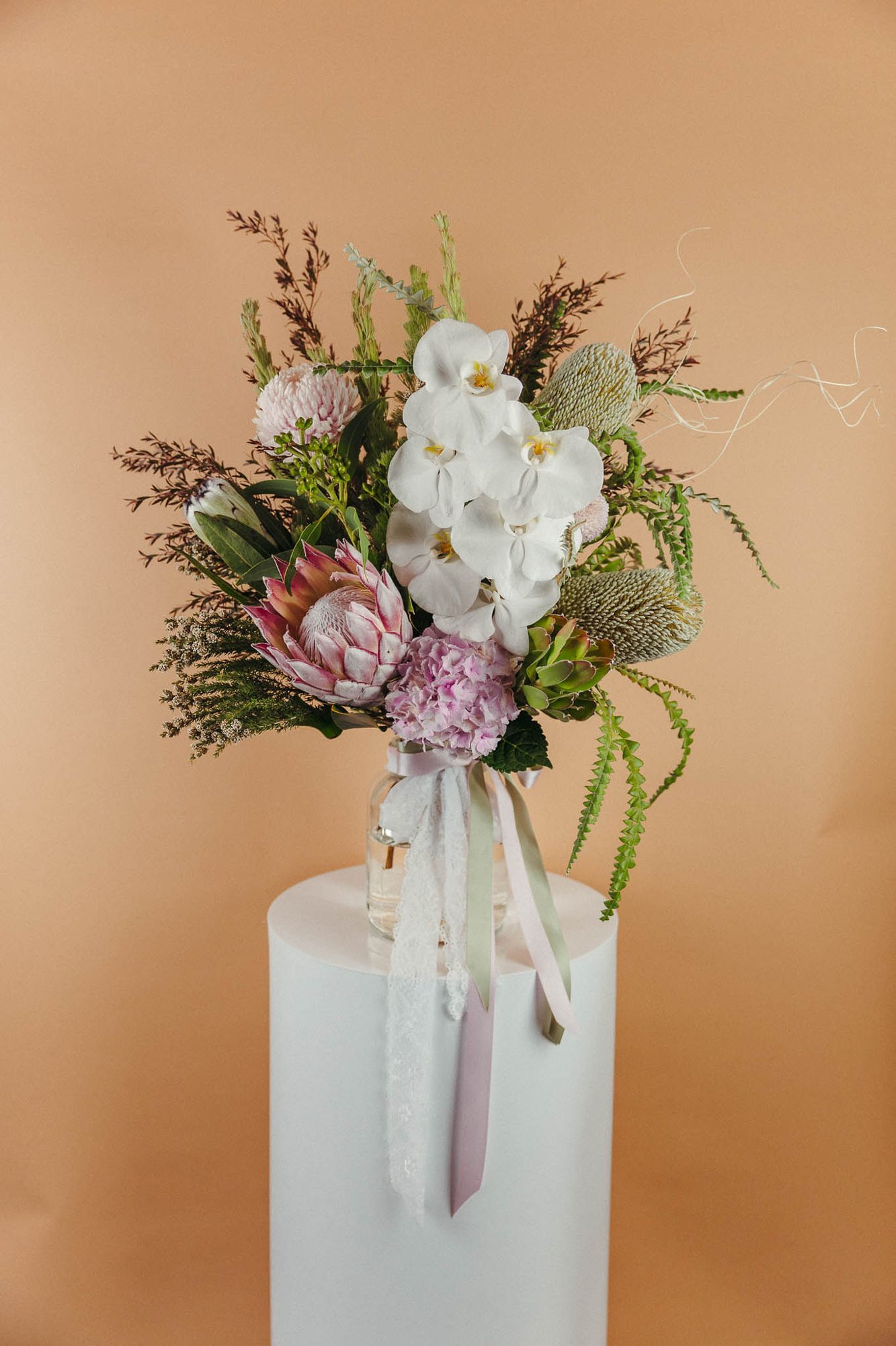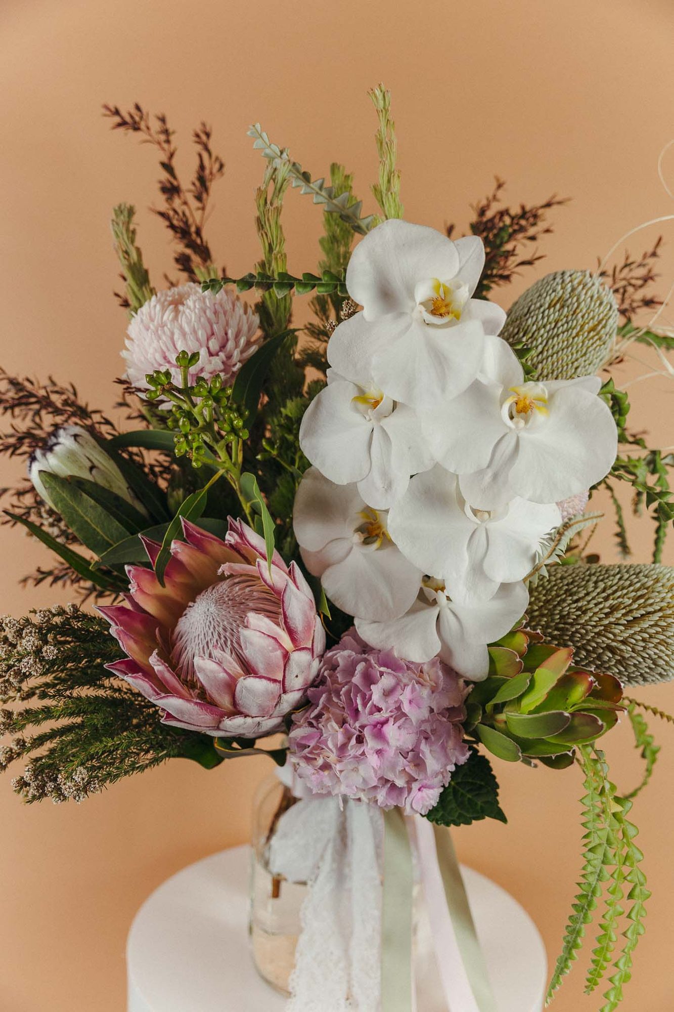 Featuring a curated mix of Australian native blooms such as proteas, banksias, and seasonal foliage, this mason vase arrangement is full of depth, texture, and earthy tones.
